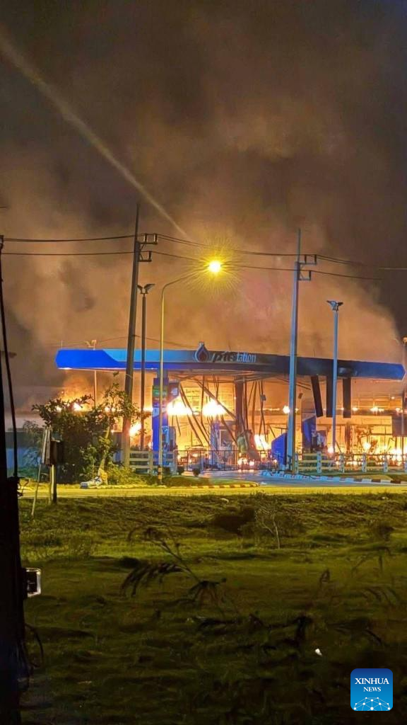 This photo released by the Royal Thai Armed Forces on Jan. 11, 2026 shows a petrol station on fire in Narathiwat, Thailand. Multiple petrol stations in Thailand's southern border provinces were hit by arson attacks and explosions late Saturday night, leaving one police officer injured, Thai military sources said on Sunday. (Royal Thai Armed Forces/Handout via Xinhua)