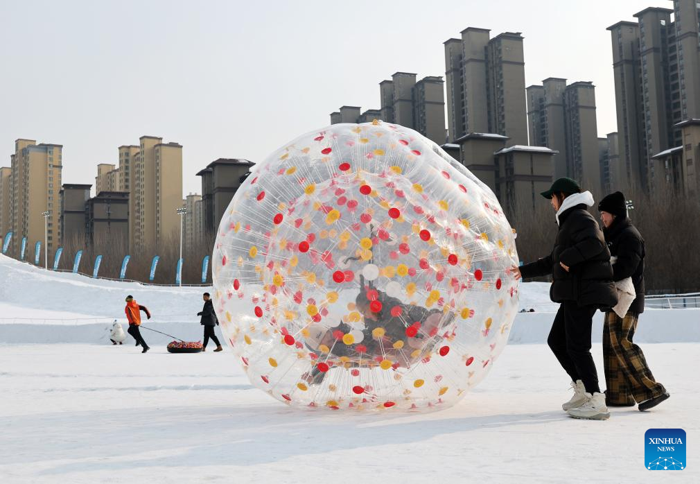 Visitors play on snow at a hot spring resort in Shenyang, northeast China's Liaoning Province, Jan. 9, 2026. Leveraging its unique natural resources, Shenyang offers special winter tourism experiences by combining ice-and-snow activities with hot springs, attracting visitors from across the country. (Xinhua/Pan Yulong)