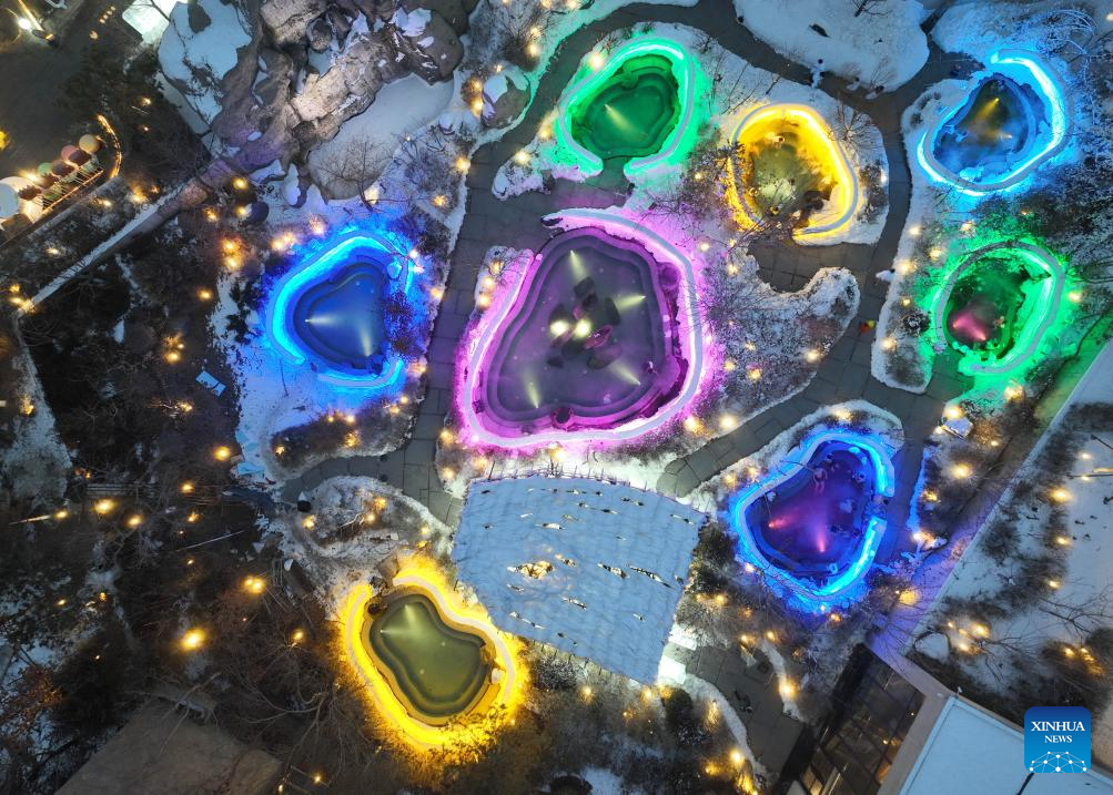 An aerial drone photo shows visitors enjoying outdoor hot spring surrounded by ice and snow at a hot spring resort in Shenyang, northeast China's Liaoning Province, Jan. 9, 2026. Leveraging its unique natural resources, Shenyang offers special winter tourism experiences by combining ice-and-snow activities with hot springs, attracting visitors from across the country. (Xinhua/Pan Yulong)