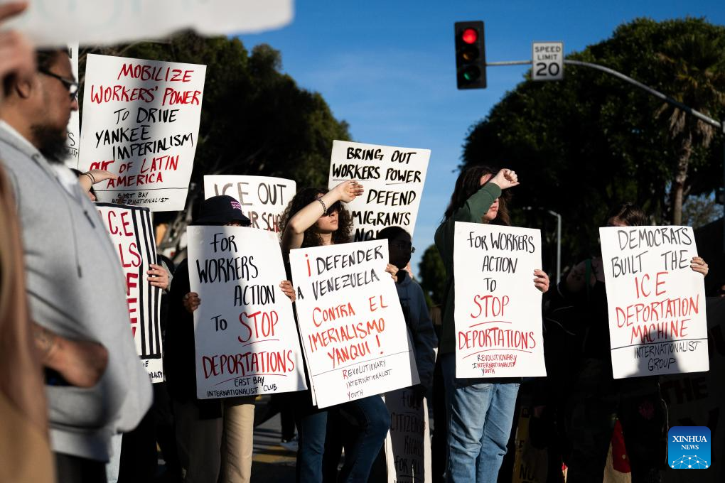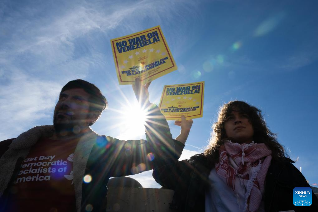 People attend a protest in San Francisco, California, the United States, on Jan. 10, 2026. People gathered here to protest against the U.S. attack on Venezuela, as well as a fatal shooting of a 37-year-old woman by an Immigration and Customs Enforcement agent in Minnesota on Jan. 7. (Photo by Ziyu Julian Zhu/Xinhua)