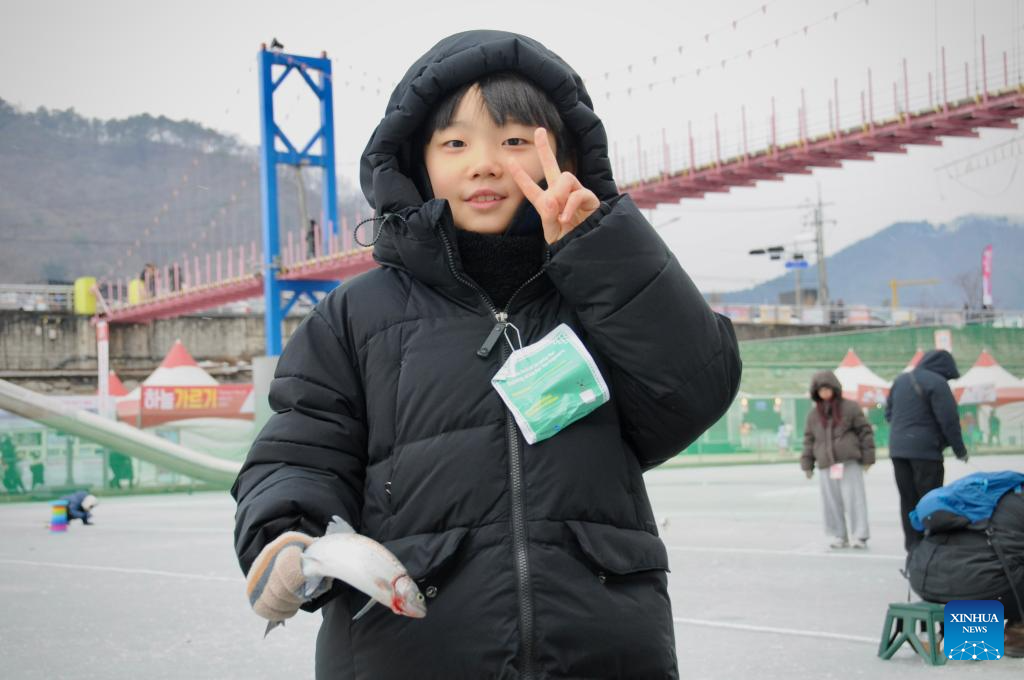 A kid holds a fish during the Hwacheon Sancheoneo Ice Festival in Hwacheon-gun, South Korea, Jan. 10, 2026. (Xinhua/Huang Xinxin)
