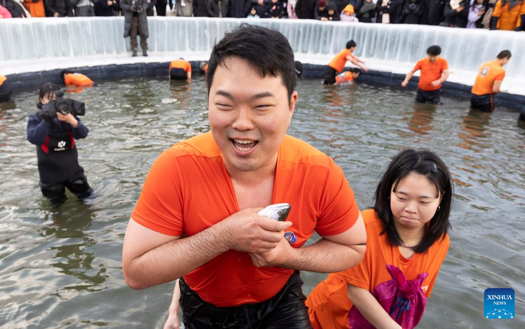 A man catches fish with bare hands during the Hwacheon Sancheoneo Ice Festival in Hwacheon-gun, South Korea, Jan. 10, 2026. (Photo by Jun Hyosang/Xinhua)