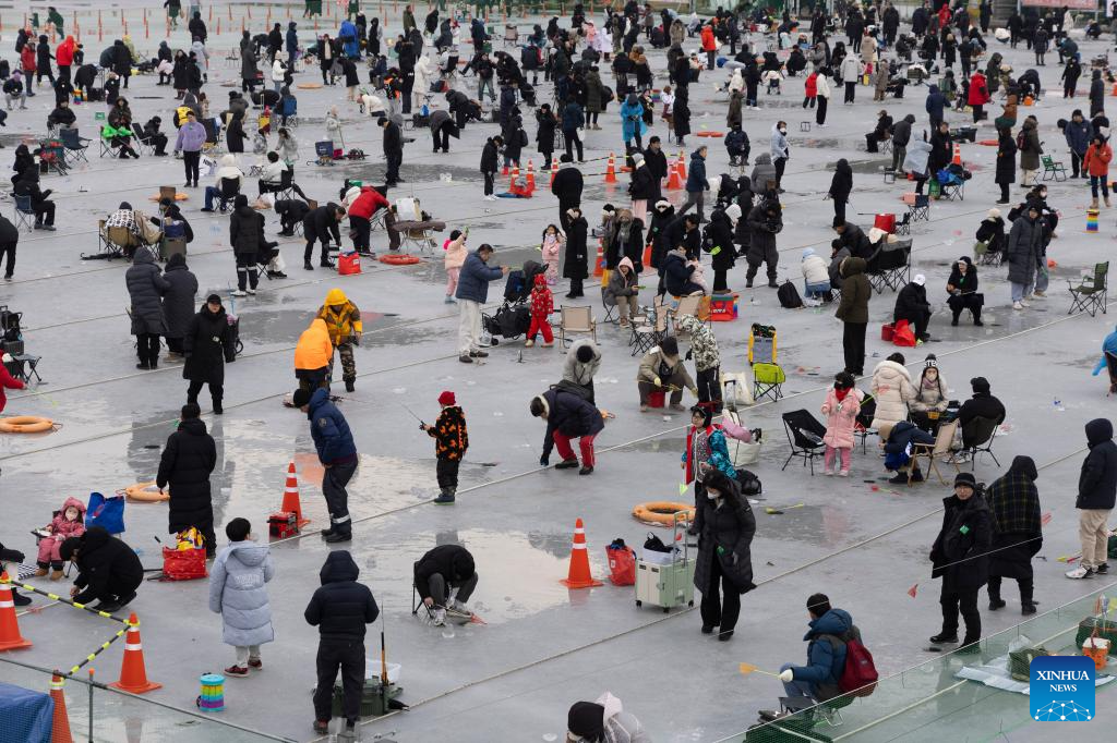 Tourists fish on a frozen river during the Hwacheon Sancheoneo Ice Festival in Hwacheon-gun, South Korea, Jan. 10, 2026. (Photo by Jun Hyosang/Xinhua)
