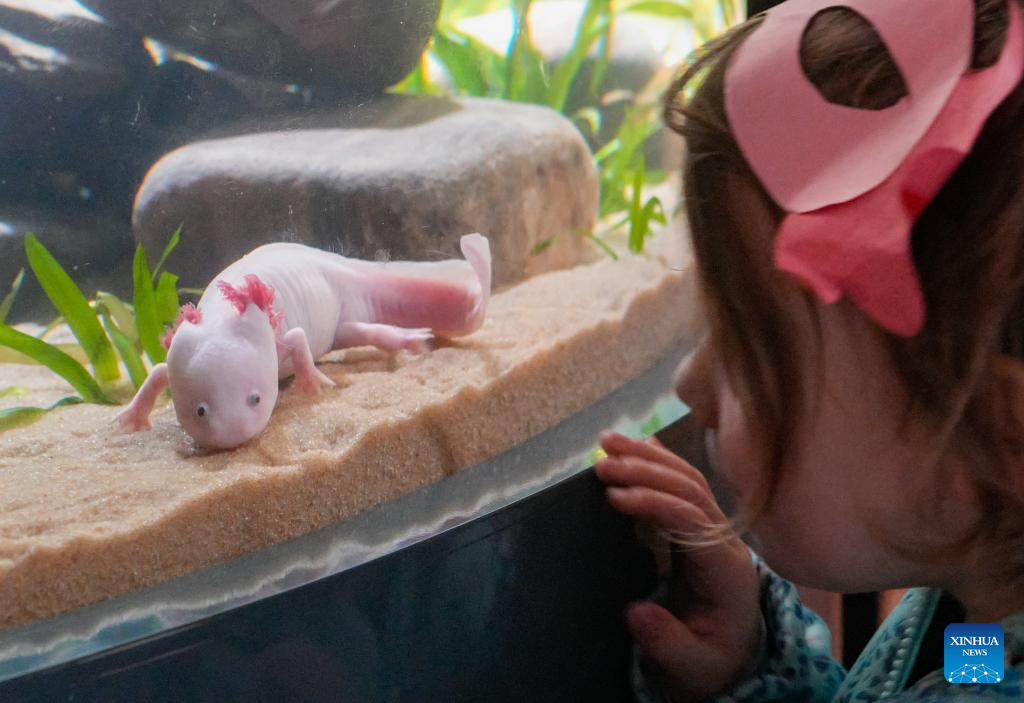 A girl observes an axolotl during the "Amazing Axolotls" exhibition at the Vancouver Aquarium in Vancouver, British Columbia, Canada, Jan. 11, 2026. The new permanent exhibit at the Vancouver Aquarium opened on Sunday features multiple habitats and interactive displays highlighting the unique biology and regenerative abilities of axolotls, an endangered amphibian native to Mexico. (Photo by Liang Sen/Xinhua)