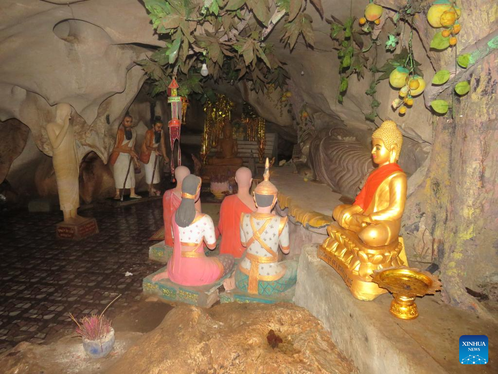 This photo taken on Dec. 3, 2023 shows an interior view of the Phnom La'ang Kang Kep cave, which is used as a sacred site, in Battambang province, Cambodia. Cambodia's Ministry of Environment, in collaboration with Fauna & Flora-Cambodia Program, on Monday released guidelines for sustainable development and management of caves, the first of their kind for the country.