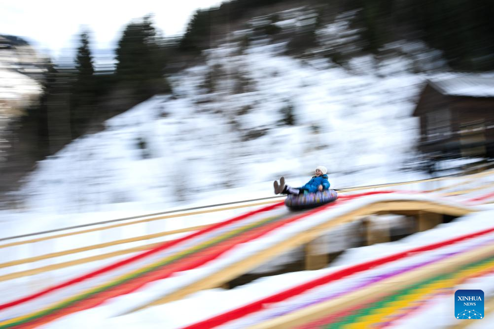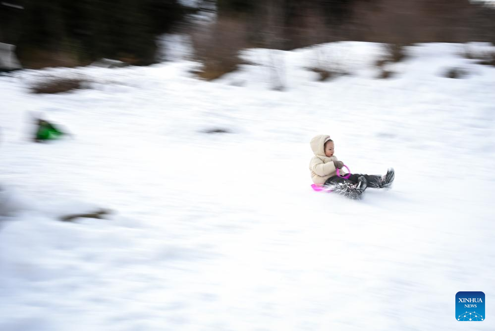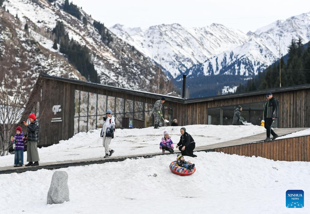 People enjoy themselves at a snow-covered mountain on the outskirts of Almaty, Kazakhstan, on Jan. 11, 2026. (Xinhua/Li Renzi)