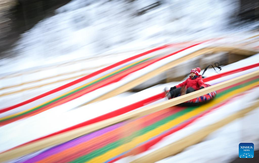 A child enjoys ice slide on the outskirts of Almaty, Kazakhstan on Jan. 11, 2026. (Xinhua/Li Renzi)