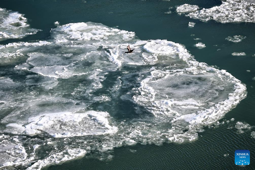A bird flies over the ice floes drifting on the Danube River in Budapest, Hungary, on Jan. 12, 2026. (Photo by David Balogh/Xinhua)
