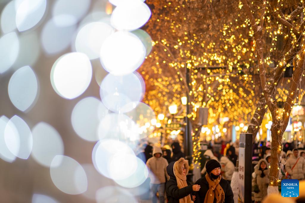People visit the Central Street in Harbin, northeast China's Heilongjiang Province, Jan. 8, 2026. As one of the most popular attractions in Harbin, the Central Street, which is renowned for its diverse European-style architecture, wows tourists with its colorful lights at night during the city's tourism boom this winter. (Xinhua/Wang Jianwei)