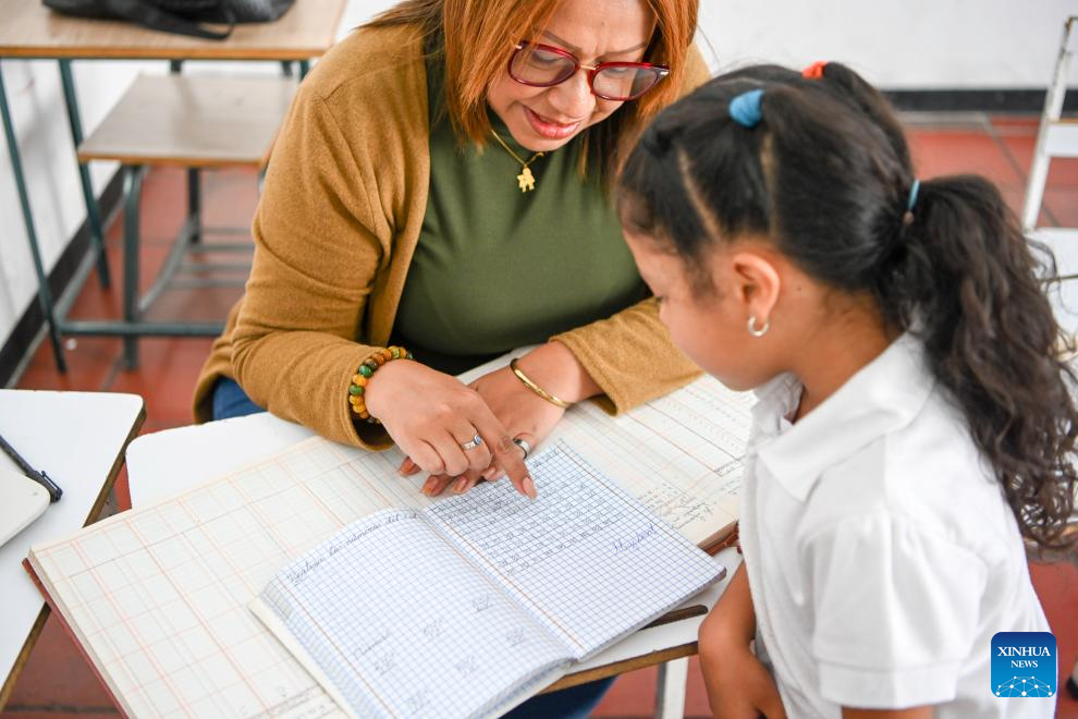 A teacher examines homework on the first day of the new semester in a public school in Caracas, Venezuela, Jan. 12, 2026. The second half of the 2025-2026 academic year for primary and secondary education began on Monday in Venezuela. (Xinhua/Ding Hongfa)