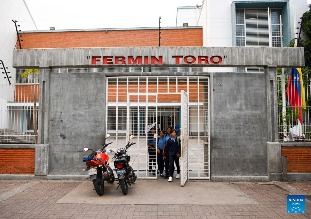 Students come out from a public school after finishing class on the first day of the new semester in Caracas, Venezuela, Jan. 12, 2026. The second half of the 2025-2026 academic year for primary and secondary education began on Monday in Venezuela. (Xinhua/Ding Hongfa)