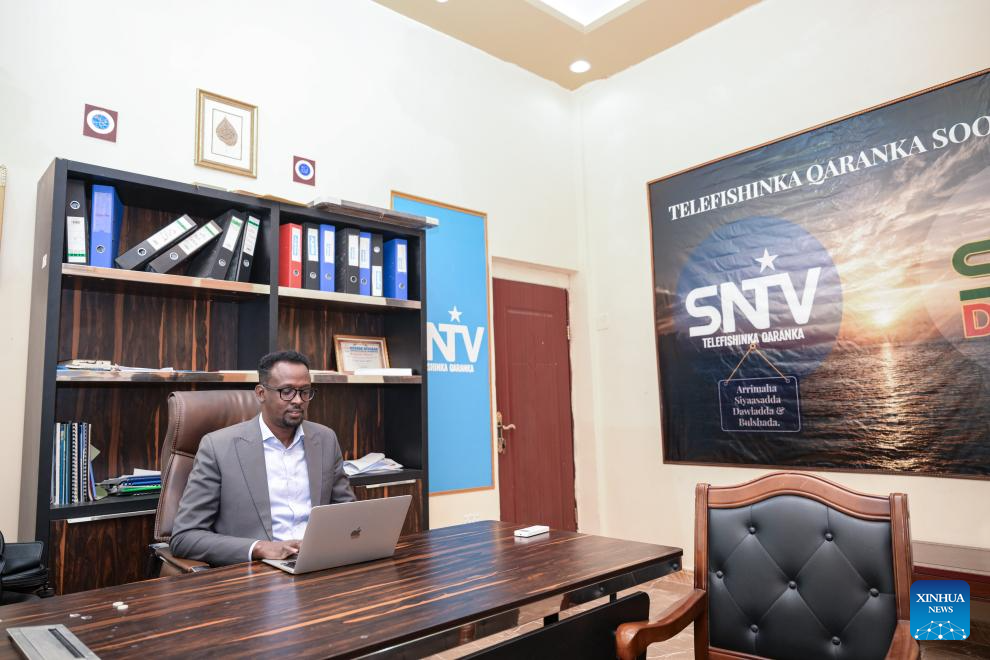 Mohamed Kafi Sheikh Abukar, director of Somali National Television (SNTV), works at his office at Somali National Television, in Mogadishu, Somalia, Jan. 12, 2026. The Somali National Television resumed its broadcasting in 2011 after a two-decade break off due to the civil war. Nowadays, it is on air around the clock for audiences both at home and abroad. (Xinhua/Yang Guang)