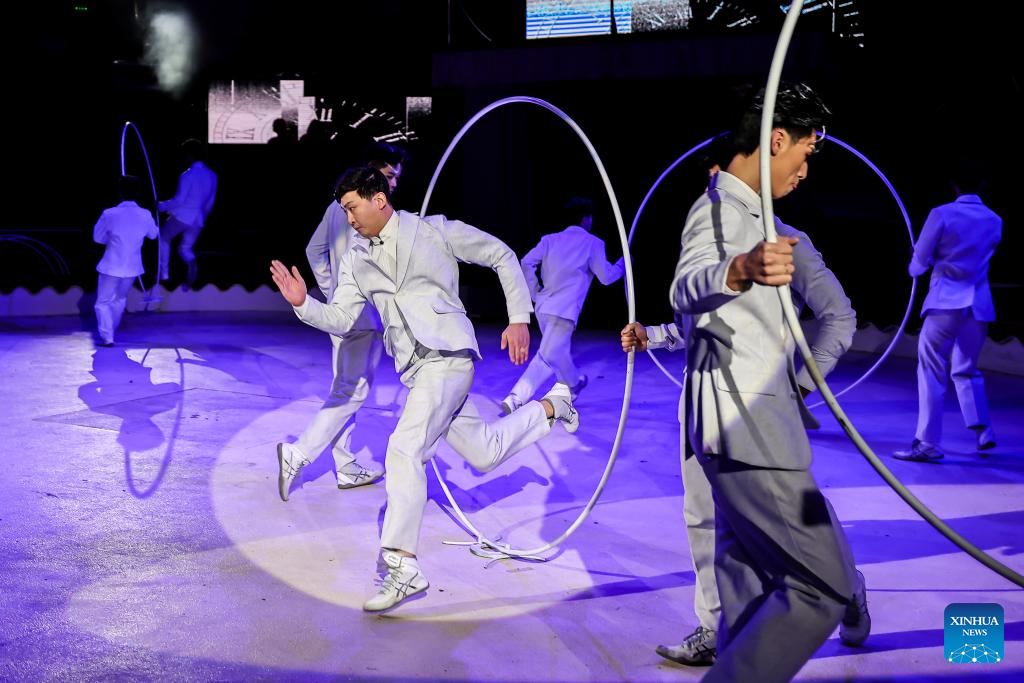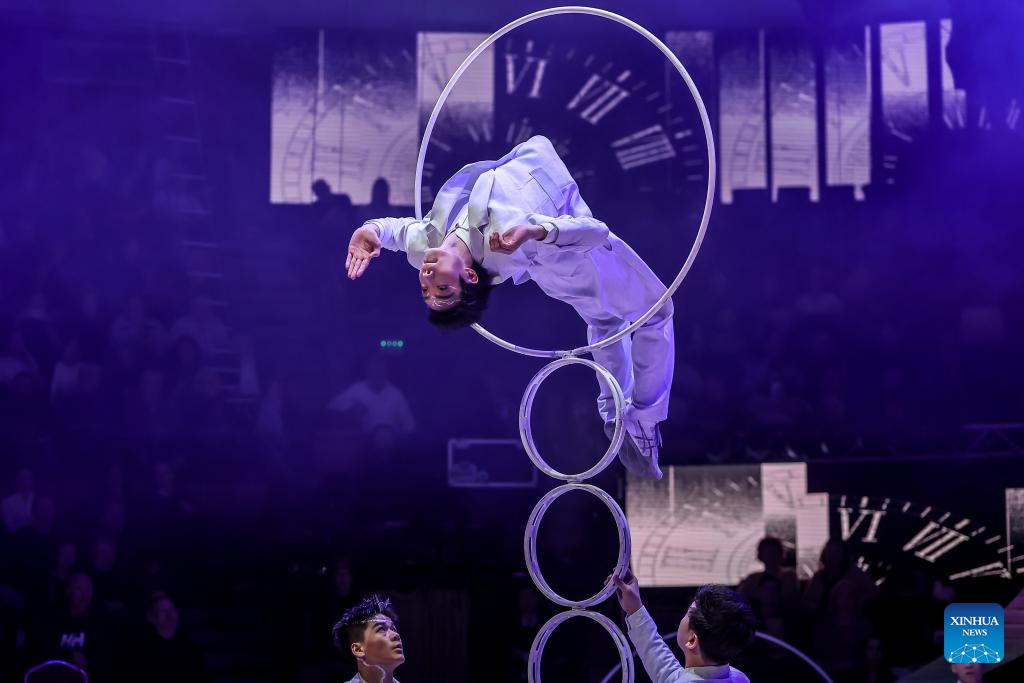 Members of the China National Acrobatic Troupe perform a hoop-diving act during the gala show of the 16th Budapest International Circus Festival in Budapest, Hungary, Jan. 12, 2026. The China National Acrobatic Troupe claimed the Grand Prix at the Budapest International Circus Festival. (Photo by David Balogh/Xinhua)