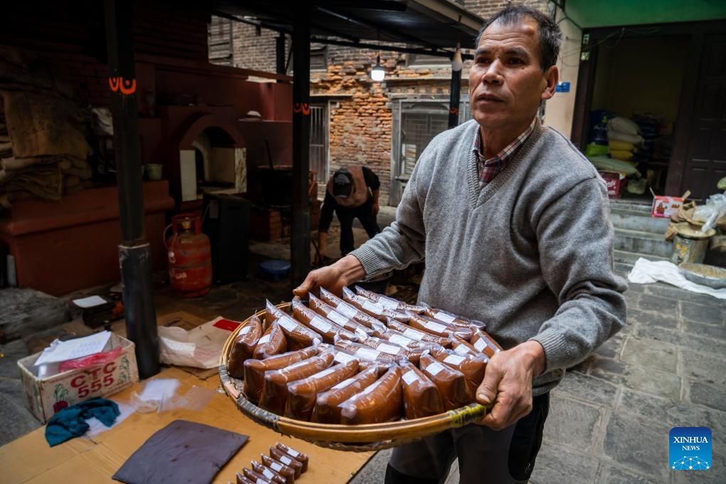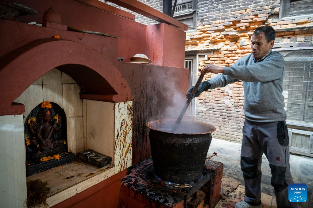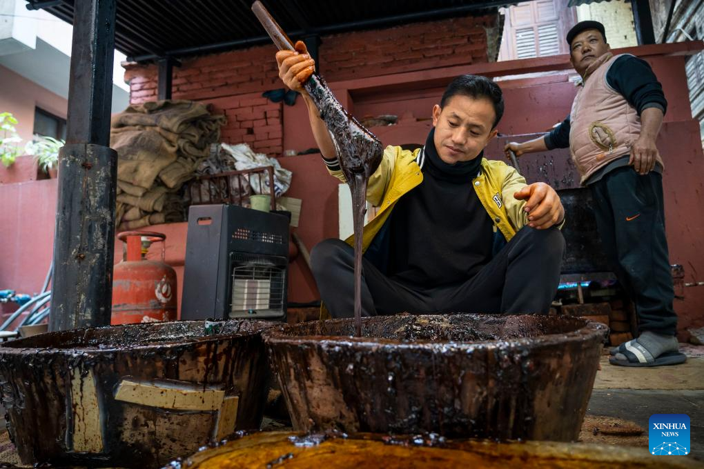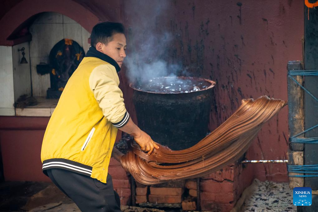 A worker prepares molasses for the upcoming Maghe Sankranti Festival at a confectionery factory in Lalitpur, Nepal, Jan. 13, 2026. Nepalese prepare molasses ("Chaku" in local language) for the festival and the winter season. (Photo by Hari Maharjan/Xinhua)