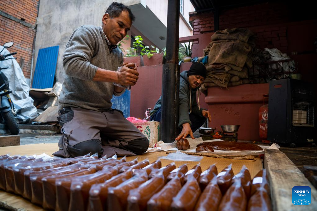 Workers pack molasses for the upcoming Maghe Sankranti Festival at a confectionery factory in Lalitpur, Nepal, Jan. 13, 2026. Nepalese prepare molasses ("Chaku" in local language) for the festival and the winter season. (Photo by Hari Maharjan/Xinhua)