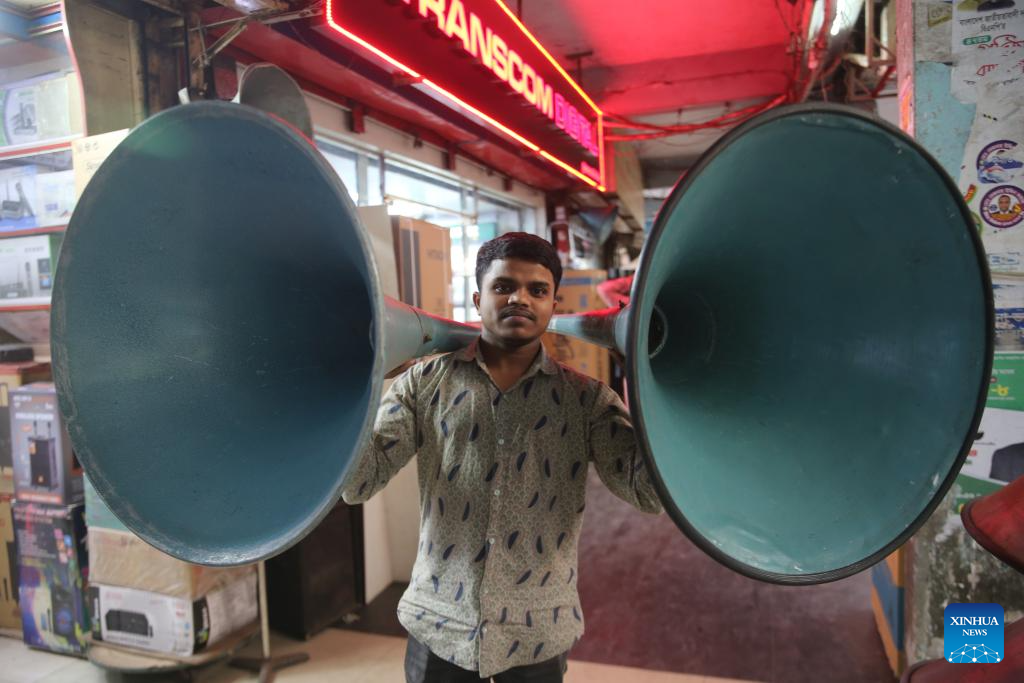 A vendor sells horn speakers in Dhaka, Bangladesh, on Jan. 13, 2026. (Photo by Habibur Rahman/Xinhua)