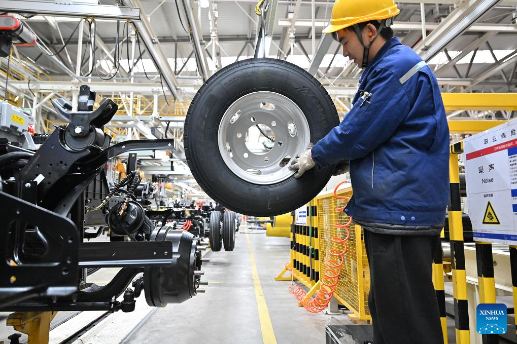 A worker operates on a light truck production line at the workshop of a new energy vehicle company in Shangqiu, central China's Henan Province, Dec. 12, 2025. (Photo by Li Heng/Xinhua)