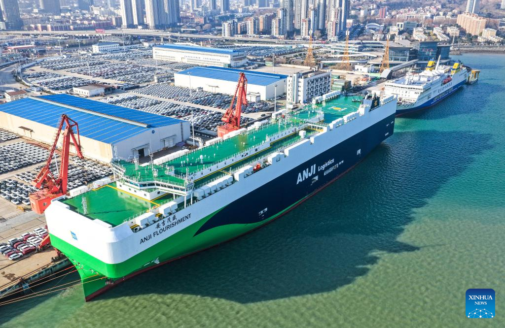 An aerial drone photo taken on Dec. 17, 2025 shows a cargo ship loading vehicles for export at Lianyungang port in Lianyungang, east China's Jiangsu Province. (Photo by Wang Jianmin/Xinhua)