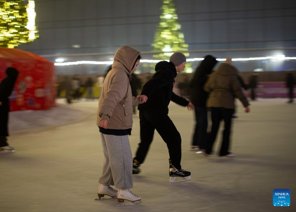 People skate at an ice rink in Almaty, Kazakhstan, on Jan. 14, 2026. In winter, people of Almaty go outdoor to enjoy the fun of ice and snow sports. (Xinhua/Li Renzi)