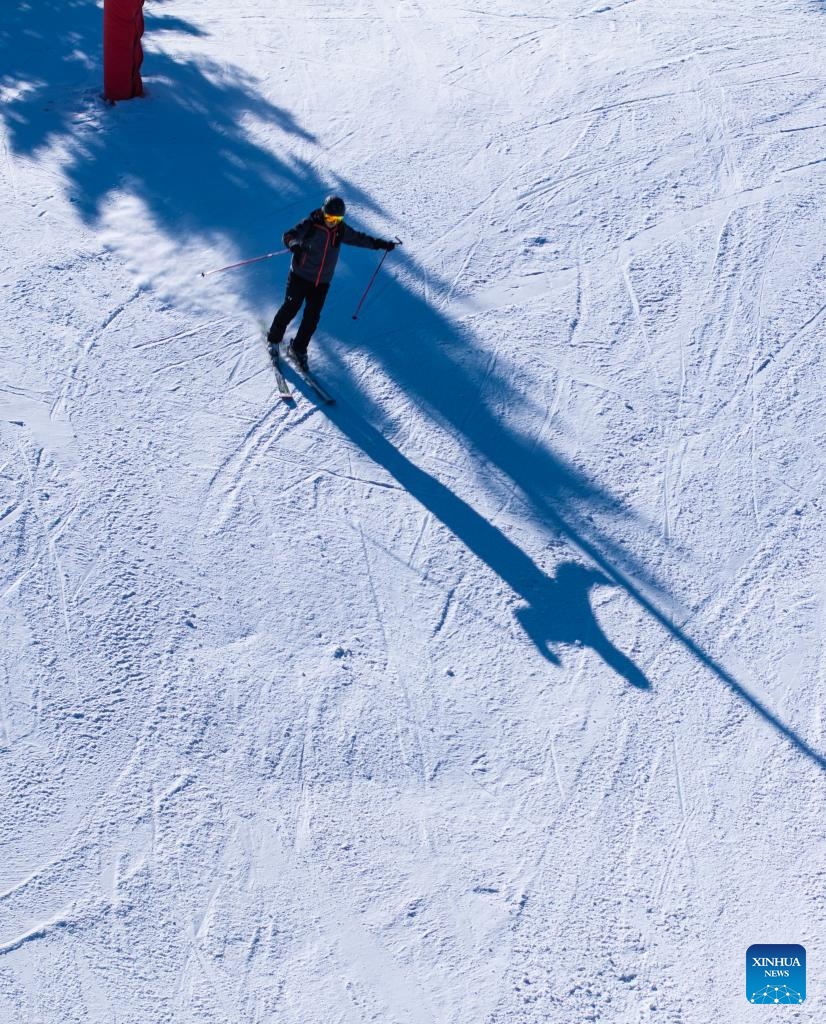 An aerial drone photo taken on Jan. 13, 2026 shows a skier skiing at a ski resort in Almaty, Kazakhstan. In winter, people of Almaty go outdoor to enjoy the fun of ice and snow sports. (Xinhua/Li Renzi)