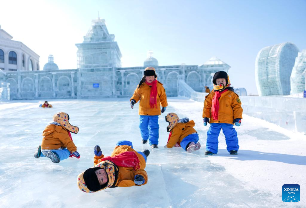 Children play at an ice-and-snow themed park in Changchun, northeast China's Jilin Province, Jan. 14, 2026.