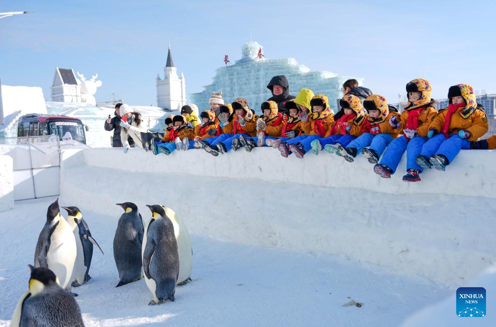 Children watch penguins at an ice-and-snow themed park in Changchun, northeast China's Jilin Province, Jan. 14, 2026.