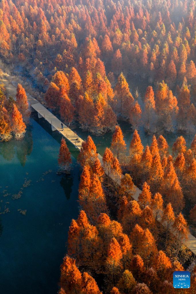 An aerial drone photo taken on Jan. 14, 2026 shows a dawn redwood wetland in Panlong District, Kunming, southwest China's Yunnan Province. (Xinhua/Hu Chao)