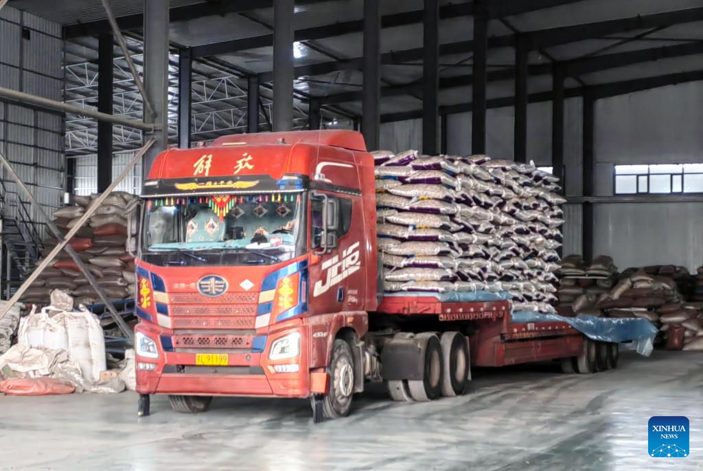 This photo taken on Dec. 22, 2025 shows a truck transporting sunflower seeds at a humming factory in Linhe District of Bayannur City, north China's Inner Mongolia Autonomous Region. (Xinhua/Li Yunping)