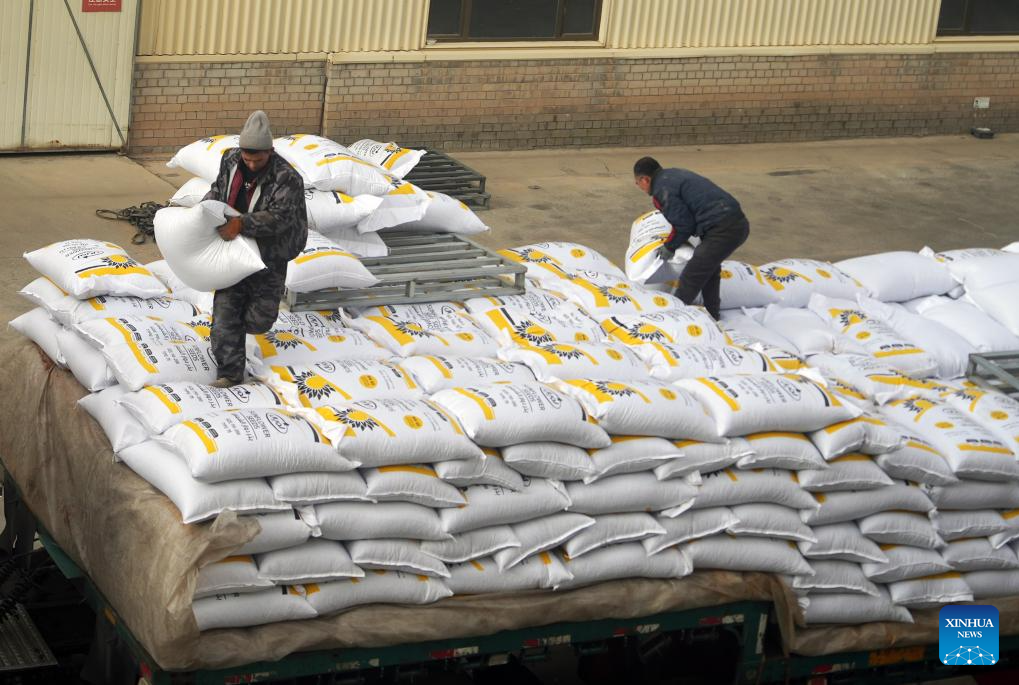 Workers transport bags of sunflower seeds at a humming factory in Linhe District of Bayannur City, north China's Inner Mongolia Autonomous Region, Dec. 27, 2025. (Xinhua/Li Yunping)