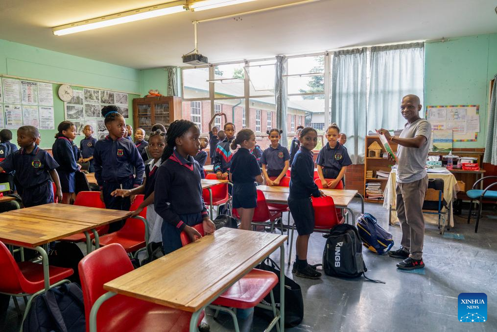 A teacher communicates with students on the first day of a new semester at a school in Johannesburg, South Africa, Jan. 14, 2026. (Photo by Shiraaz Mohamed/Xinhua)
