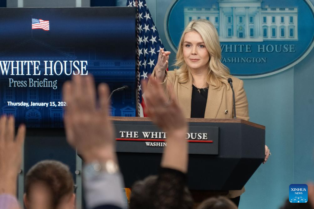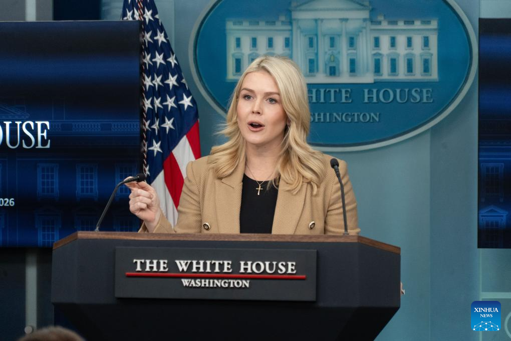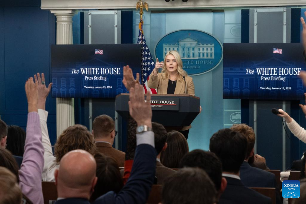 White House Press Secretary Karoline Leavitt speaks during a press briefing at the White House in Washington, D.C., the United States, on Jan. 15, 2026. U.S. President Donald Trump is keeping all options on the table for responding to Iran's unrest, White House Press Secretary Karoline Leavitt said Thursday. (Photo by Li Yuanqing/Xinhua)
