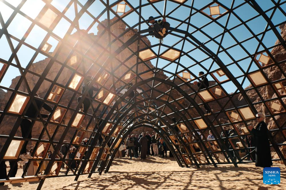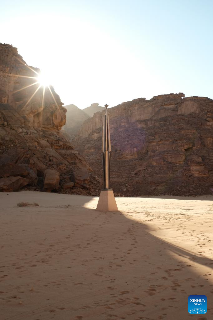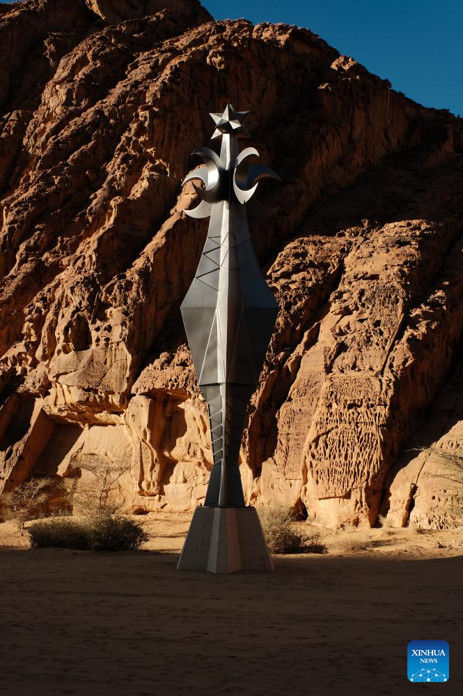 This photo taken on Jan. 15, 2026 shows an artwork exhibited during a preview of the art exhibition Desert X AlUla held in AlUla, Saudi Arabia. Running from Jan. 16 to Feb. 28, Desert X AlUla opens its fourth edition here on Friday, showcasing 11 site-responsive artworks across valleys, canyons, and oases under the theme "Space Without Measure." (Xinhua/Xin Mengchen)