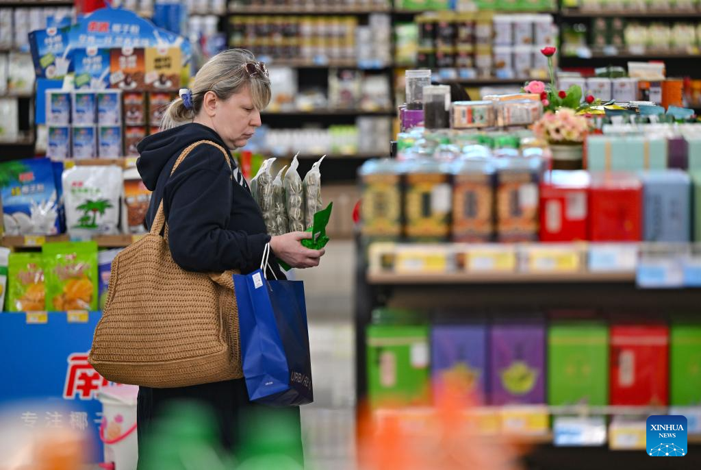 Foreign tourists check out at a market in Sanya, south China's Hainan Province, on Jan. 11, 2026. Hainan, now at its peak season, witnesses a booming wave of inbound travelers.