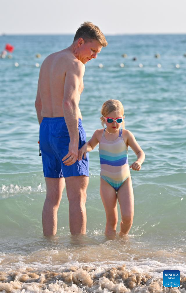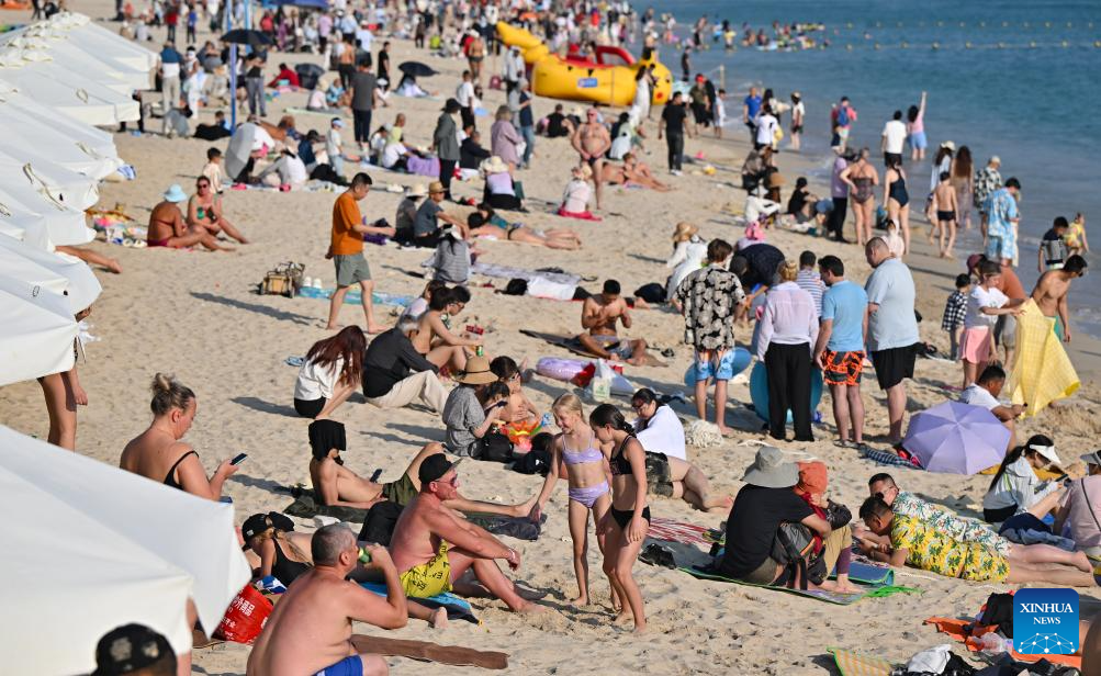Tourists have fun at the Dadonghai scenic area in Sanya, south China's Hainan Province, on Jan. 11, 2026. Hainan, now at its peak season, witnesses a booming wave of inbound travelers.