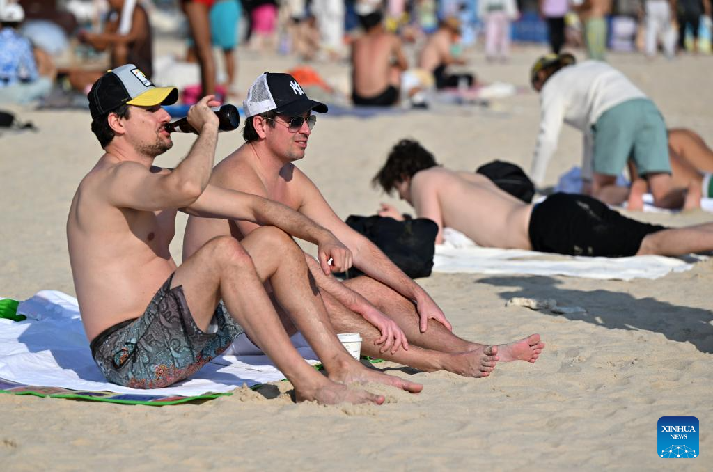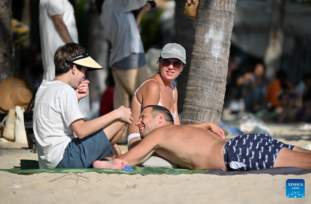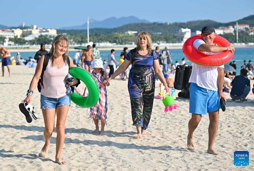 Foreign tourists have fun at the Dadonghai scenic area in Sanya, south China's Hainan Province, on Jan. 11, 2026. Hainan, now at its peak season, witnesses a booming wave of inbound travelers.