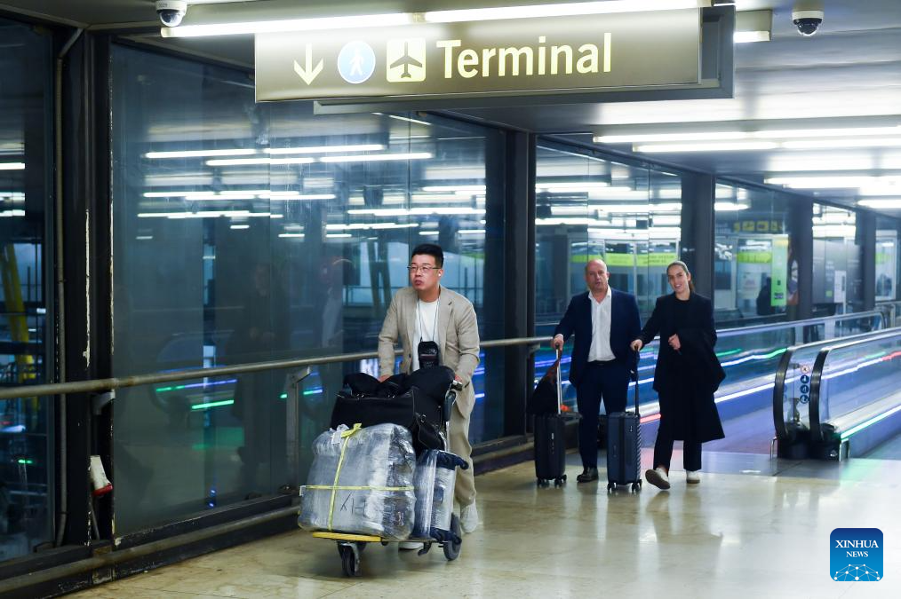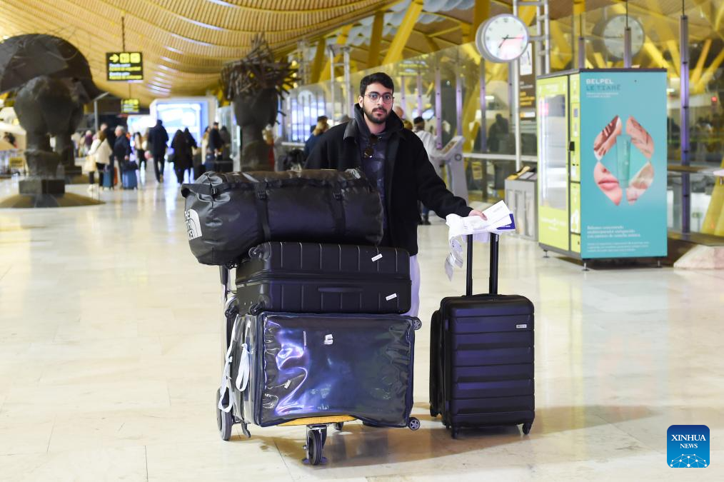 A man carrying his luggage is pictured at the Adolfo Suarez Madrid-Barajas Airport in Madrid, Spain, on Jan. 15, 2026. A total of 97 million foreign tourists visited Spain in 2025, setting a new all-time record for international visitors to the country, Spanish Minister of Industry and Tourism Jordi Hereu announced on Thursday. (Photo by Gustavo Valiente/Xinhua)
