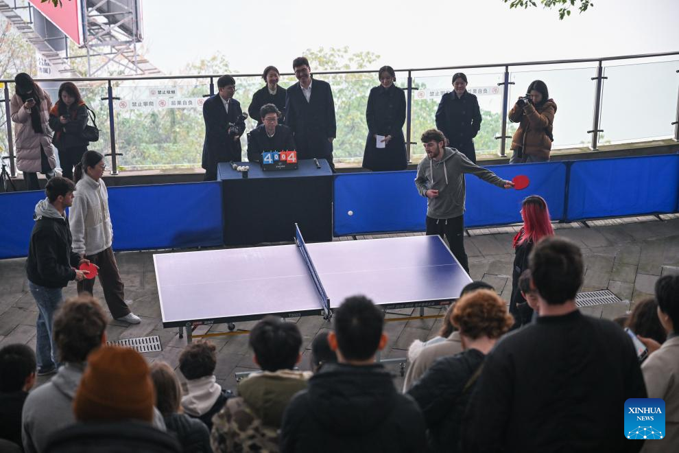 Chinese and American youths participate in a friendly game of ping-pong at the Stilwell Museum in southwest China's Chongqing, on Jan. 16, 2026. Nineteen faculty and students from Elon University in the United States joined peers from Sichuan University, Sichuan International Studies University, and Chongqing Nankai Secondary School for an exchange event at the Stilwell Museum on Friday. The Museum is named after Joseph Stilwell, a U.S. general who helped the Chinese people in their fight against Japanese aggression during World War II.