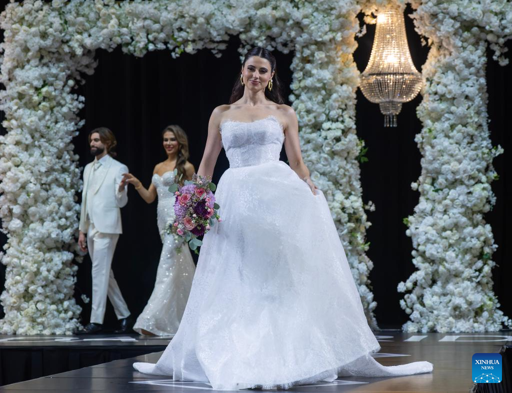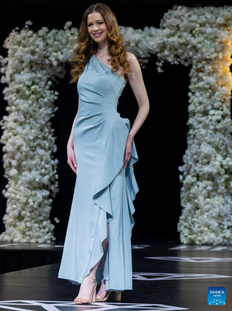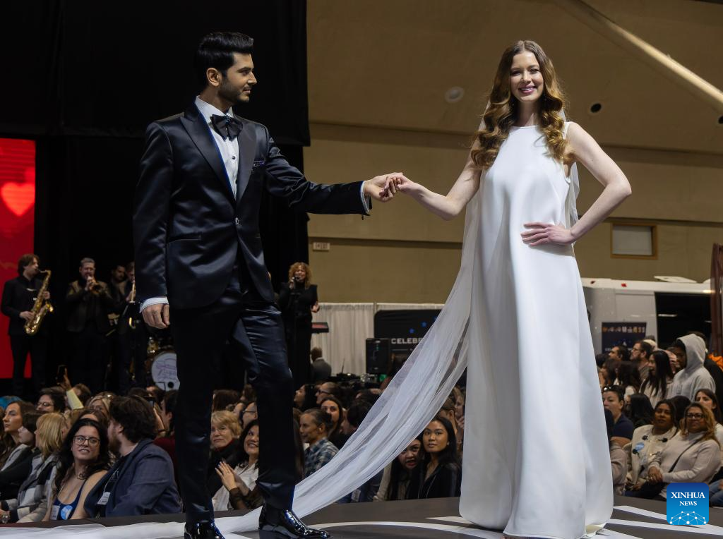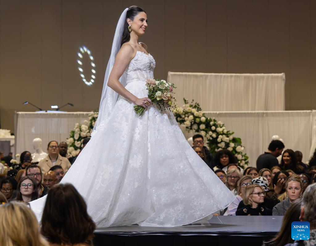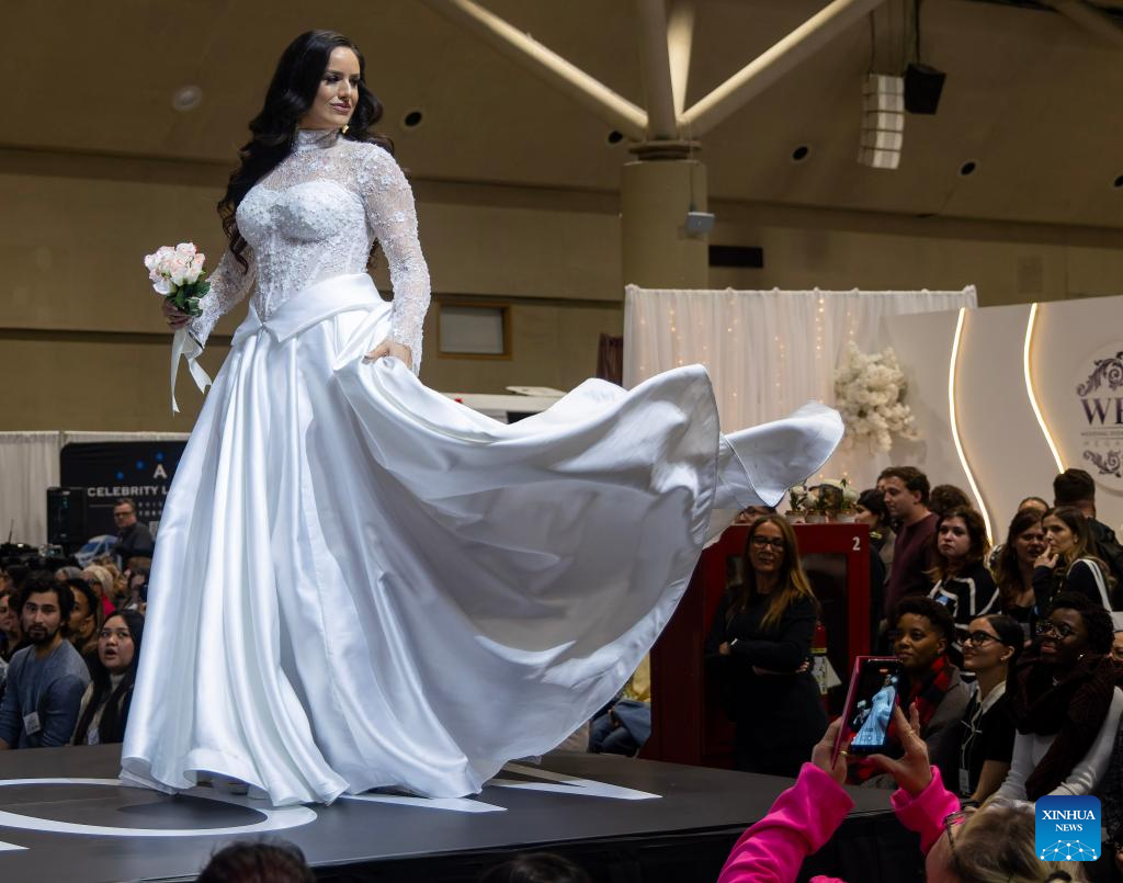 A model presents a wedding dress during the 2026 Canada's Bridal Show in Toronto, Canada, on Jan. 17, 2026. Showcasing the latest trends in bridal fashion, the annual event has been held here from Jan. 16 to 18 this year. (Photo by Zou Zheng/Xinhua)