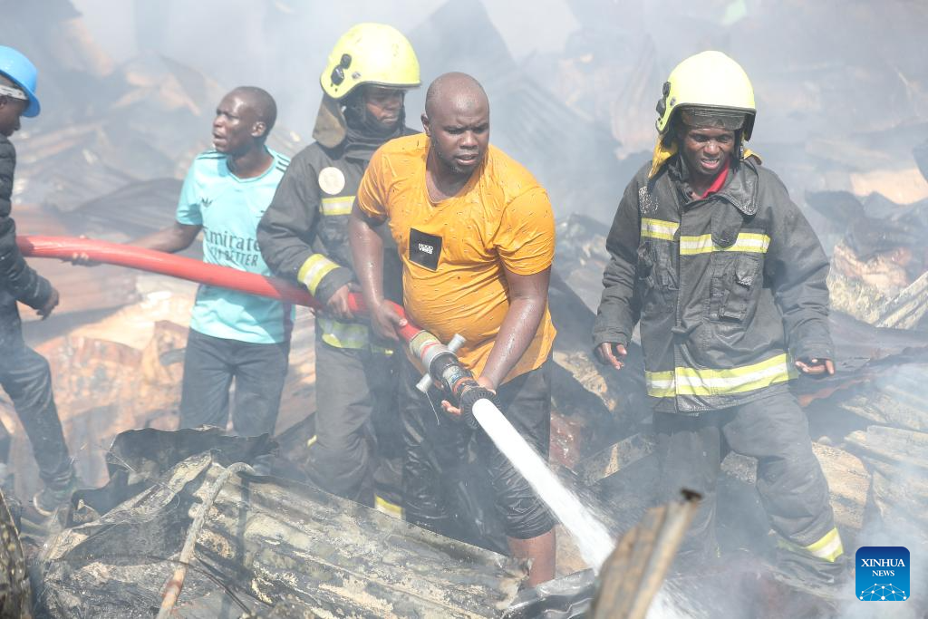 People try to put out a fire in Kibera slum in Nairobi, Kenya, on Jan. 17, 2026. A fire broke out here on Saturday, causing dozens of houses burned down. No casualties have been reported yet. (Photo by Henry Naminde/Xinhua)