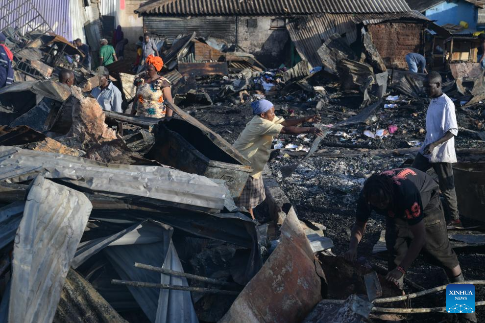 People clean the debris of houses burned down during a fire at Kibera slum in Nairobi, Kenya, on Jan. 17, 2026. A fire broke out here on Saturday, causing dozens of houses burned down. No casualties have been reported yet. (Xinhua/Yang Guang)
