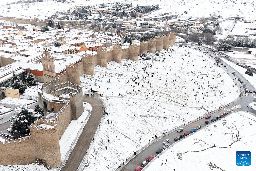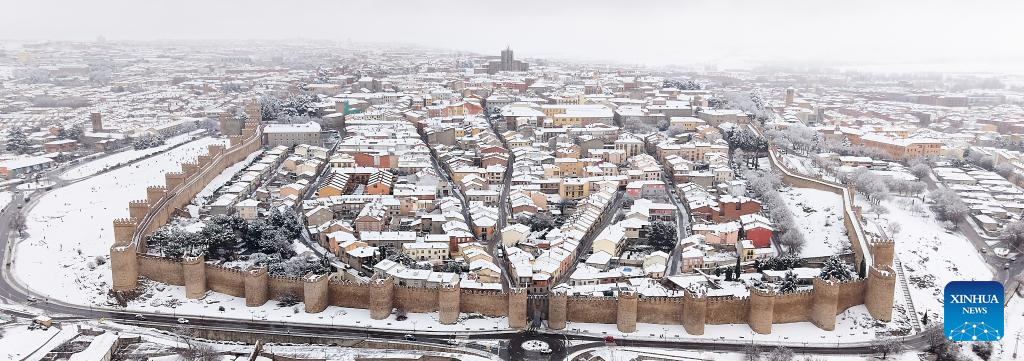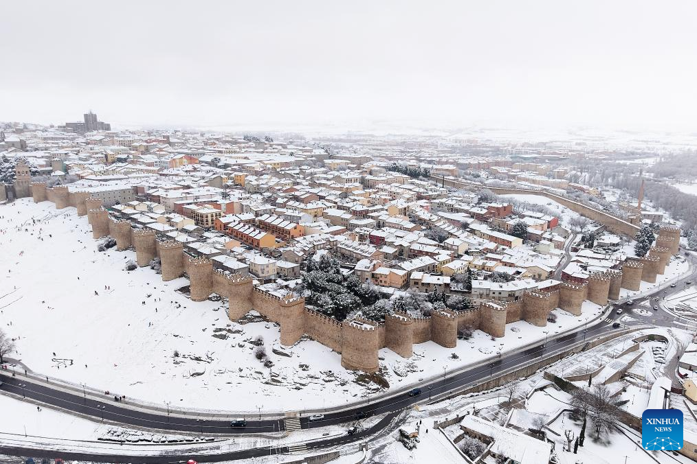 An aerial drone photo taken on Jan. 17, 2026 shows a view of the snow-covered Avila, Spain. Avila is renowned as a UNESCO World Heritage Site for its well-preserved medieval walls, built in the 11th century and stretching about 2.5 kilometers. (Xinhua/Meng Dingbo)