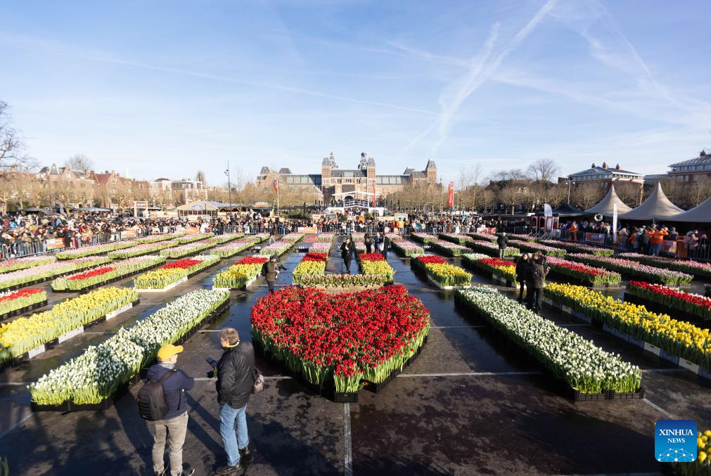 This photo taken on Jan. 17, 2026 shows a view of a huge picking garden with more than 200,000 tulips on the Museum Square in Amsterdam, the Netherlands. The Dutch celebrated the annual National Tulip Day, which is traditionally marked on the third Saturday of the year. (Photo by Sylvia Lederer/Xinhua)