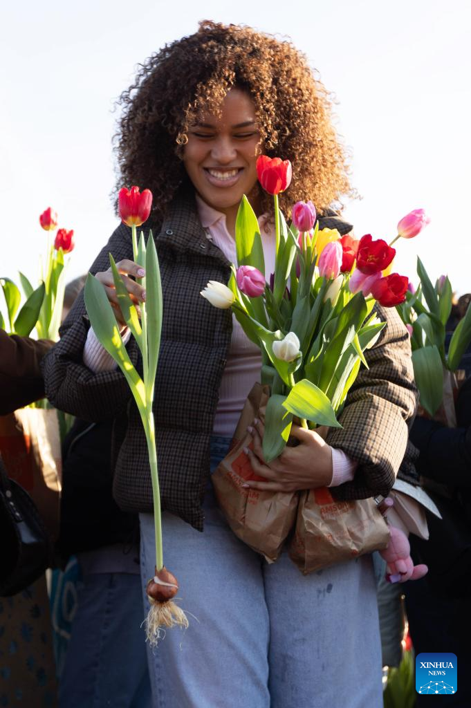 A woman picks tulips at a huge picking garden with more than 200,000 tulips on the Museum Square in Amsterdam, the Netherlands, Jan. 17, 2026. The Dutch celebrated the annual National Tulip Day, which is traditionally marked on the third Saturday of the year. (Photo by Sylvia Lederer/Xinhua)