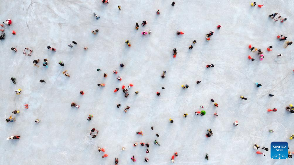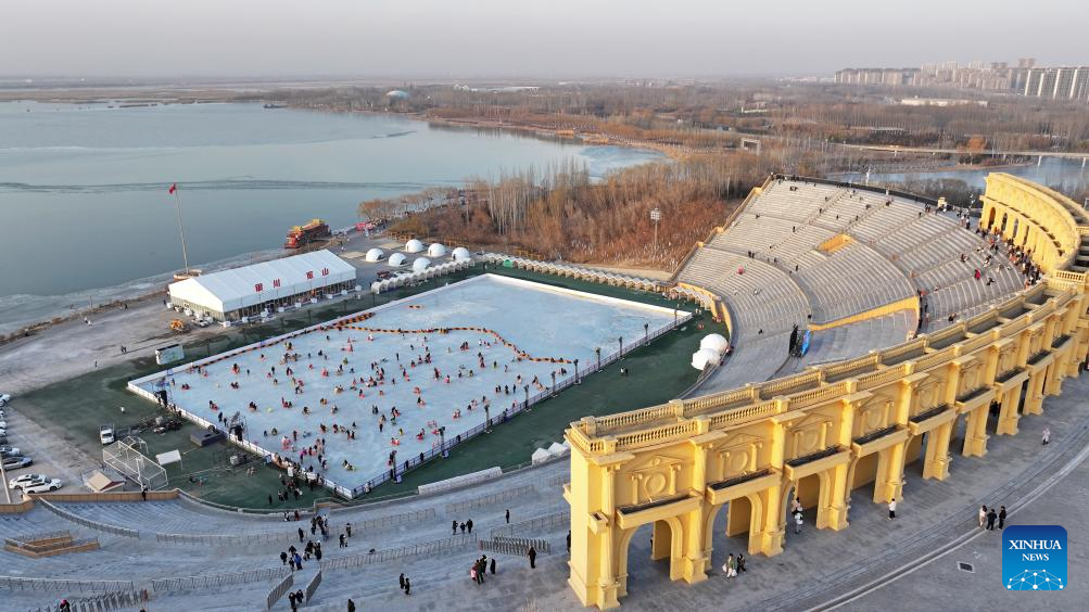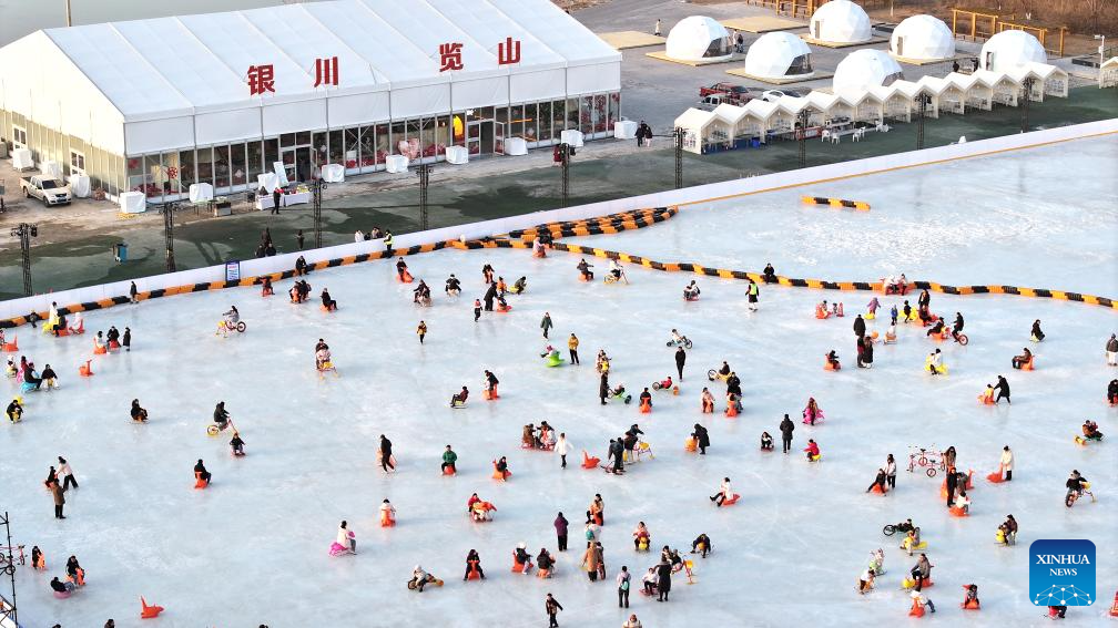 An aerial drone photo shows people having fun on an ice rink at a park in Yinchuan, northwest China's Ningxia Hui Autonomous Region, Jan. 17, 2026. (Xinhua/Wang Peng)