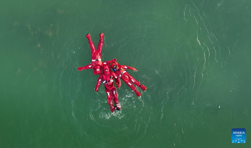 An aerial drone photo shows people in crayfish costumes experiencing floating on the water at a park in Yinchuan, northwest China's Ningxia Hui Autonomous Region, Jan. 17, 2026. (Xinhua/Wang Peng)