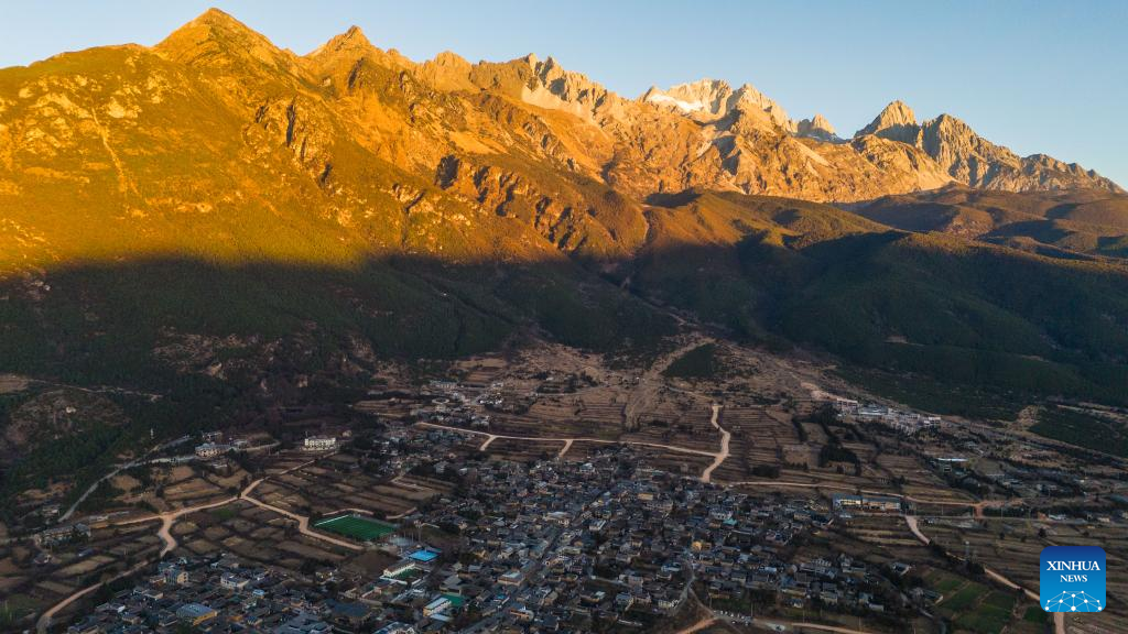 A drone photo taken from Yuhu Village shows a sunrise view of Yulong Snow Mountain in Lijiang City, southwest China's Yunnan Province, Jan. 18, 2026. Yuhu Village, nestled in Baisha Township of Yulong Naxi Autonomous County in the city of Lijiang in Yunnan, is one of the earliest settlements of the Naxi ethnic people. The village was once among the poorest villages in Lijiang because of its poor soil and limited transportation links.