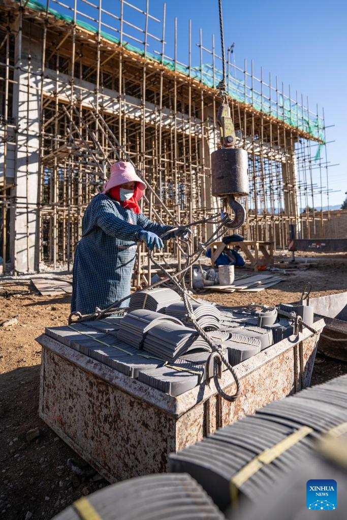 A worker hooks tiles onto a crane at a construction site in Yuhu Village, Lijiang City, southwest China's Yunnan Province, Jan. 18, 2026. Yuhu Village, nestled in Baisha Township of Yulong Naxi Autonomous County in the city of Lijiang in Yunnan, is one of the earliest settlements of the Naxi ethnic people. The village was once among the poorest villages in Lijiang because of its poor soil and limited transportation links.