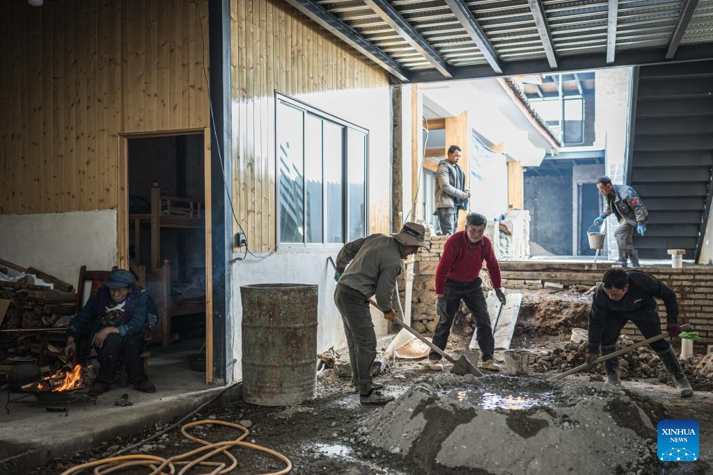 People work at the construction site of a homestay in Yuhu Village, Lijiang City, southwest China's Yunnan Province, Jan. 17, 2026. Yuhu Village, nestled in Baisha Township of Yulong Naxi Autonomous County in the city of Lijiang in Yunnan, is one of the earliest settlements of the Naxi ethnic people. The village was once among the poorest villages in Lijiang because of its poor soil and limited transportation links.