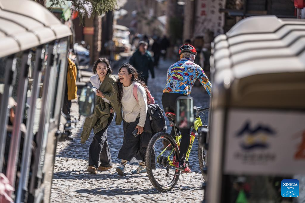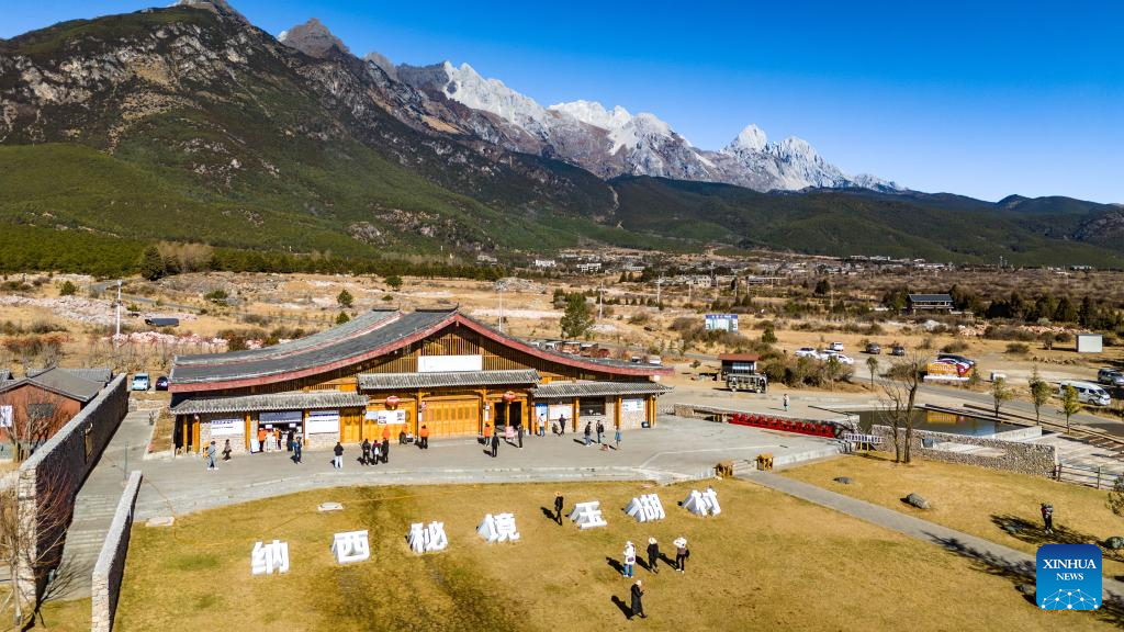 People visit the Yuhu Village of Lijiang City, southwest China's Yunnan Province, Jan. 17, 2026. Yuhu Village, nestled in Baisha Township of Yulong Naxi Autonomous County in the city of Lijiang in Yunnan, is one of the earliest settlements of the Naxi ethnic people. The village was once among the poorest villages in Lijiang because of its poor soil and limited transportation links.