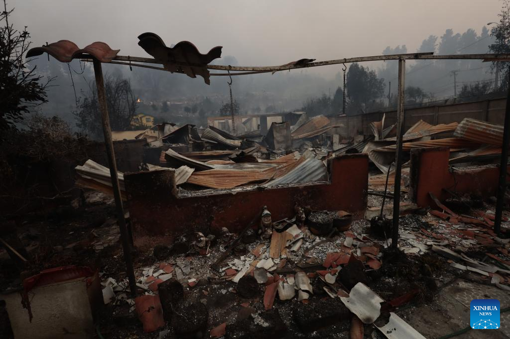 This photo shows burnt-down buildings at the site of a forest fire in Penco, Biobio region, Chile, Jan. 18, 2026. Chilean President Gabriel Boric announced a state of catastrophe in the regions of Nuble and Biobio on Sunday after forest fires killed at least 16 people.